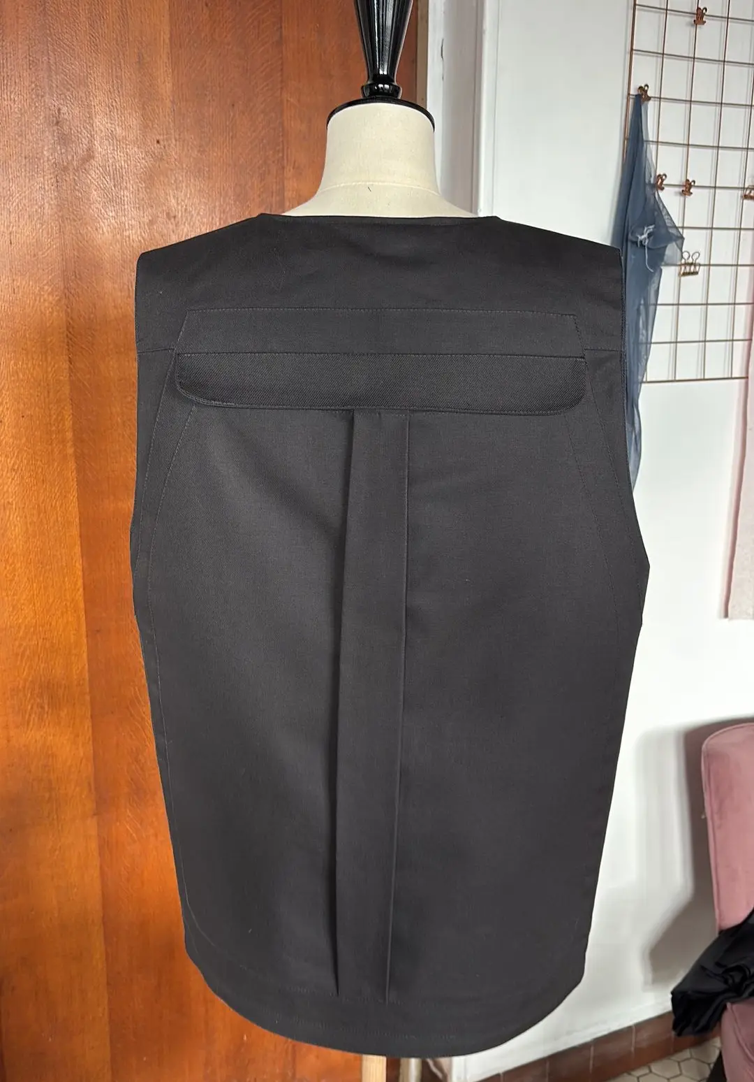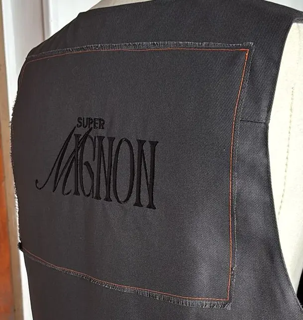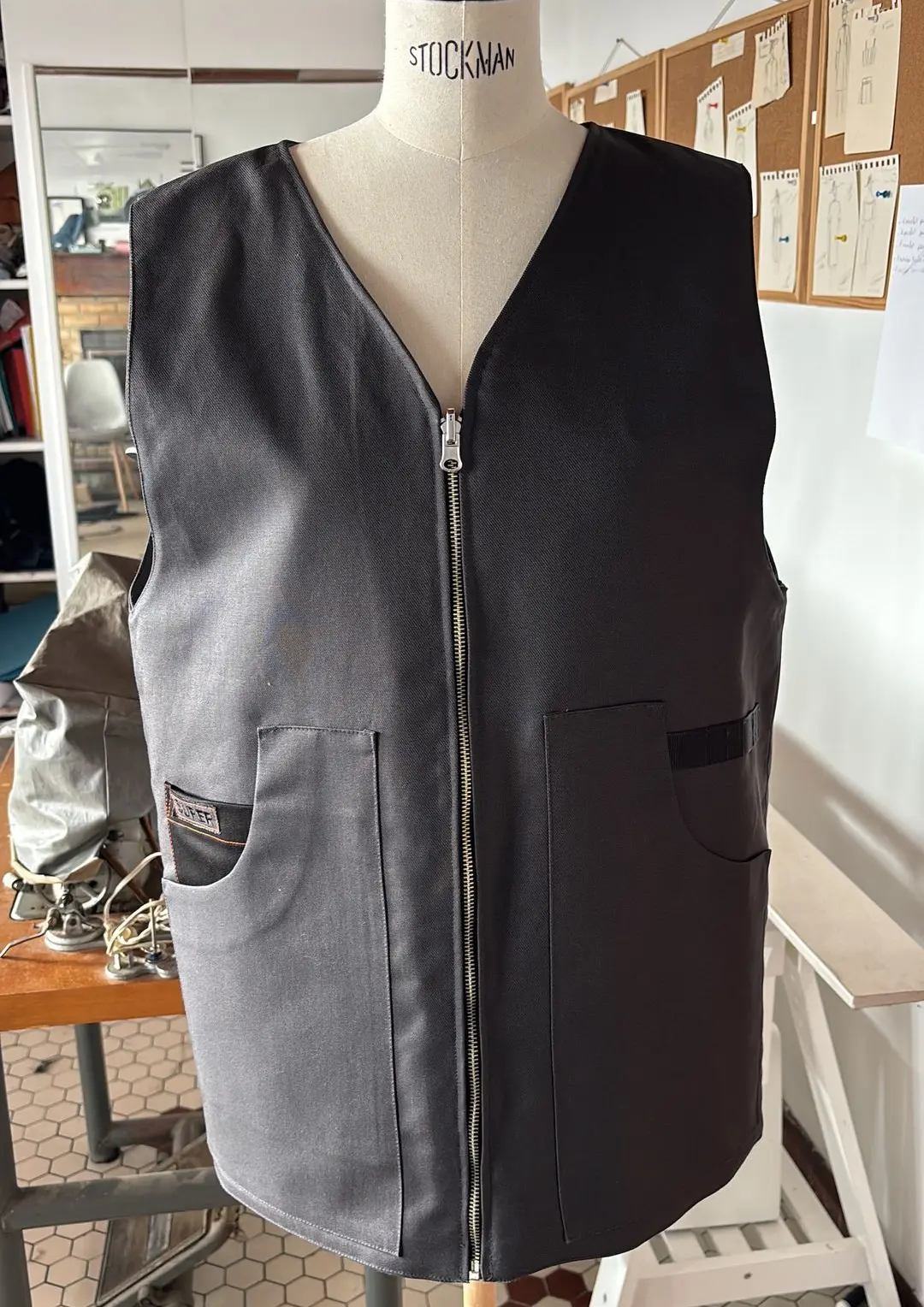On a commencé à réfléchir ensemble à une veste qui lui correspondrait vraiment. L’idée s’est vite orientée vers une pièce réversible, sans manches, à la fois pratique et adaptée à la scène.