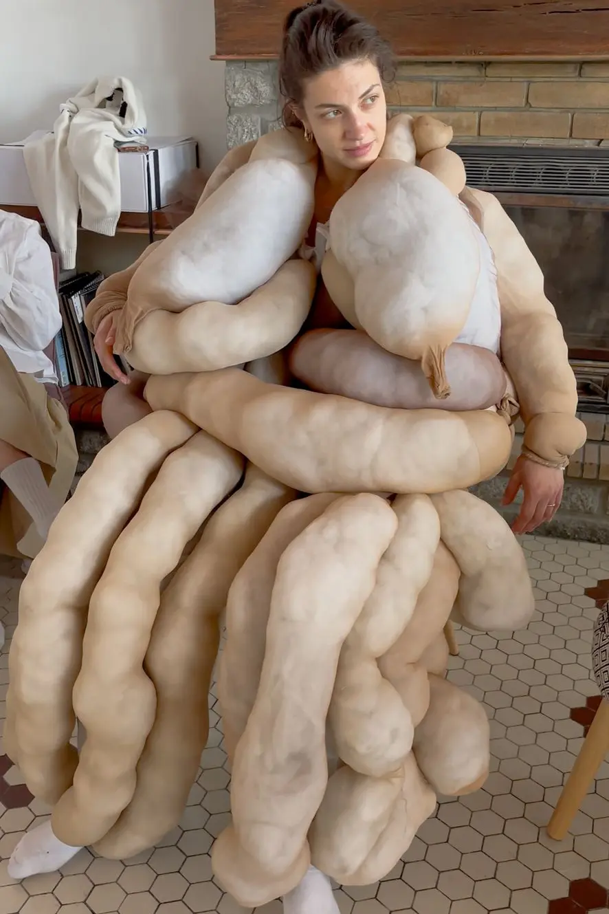 Nous avons commencé avec des matériaux basiques : des collants et du rembourrage blanc, ainsi qu'une combinaison de peinture et une vieille couette pour assembler le tout. Une fois Lucie installée dans sa chaise avec sa combinaison de peintre, j'ai rembourré les collants avant de les façonner et de les coudre à la combinaison. L'objectif était d'obtenir un effet visuel saisissant.
